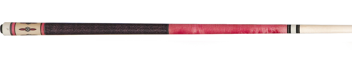 This cue in our JP Series collection is a pink-stained figured maple cue with ebony framed pearl and pink pearl inlays. It also includes a black and pink Irish linen wrap.