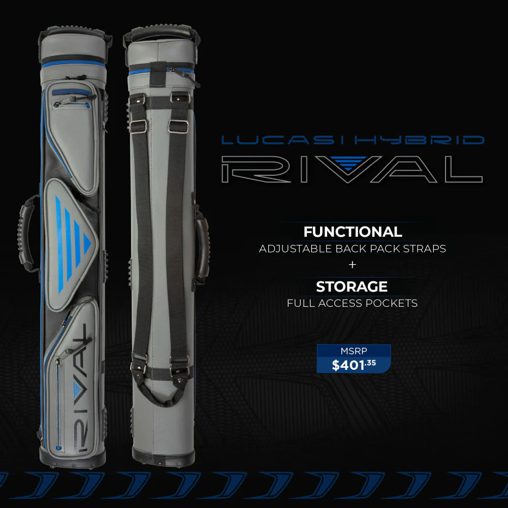 Chase your rival with style and superior functionality. The PXC2034 3X4 Lucasi Hybrid Rival Grey/Blue Case offers maximum carrying capacity with 6 zippered compartments, one of which is a full case jump cue storage compartment. This case is made up of a durable grey blue and black vinyl material, and a backpack strap or convenient carrying handles. Show up in the game looking and feeling your best with this 3 butt 4 shaft Rival hard case from Lucasi.
