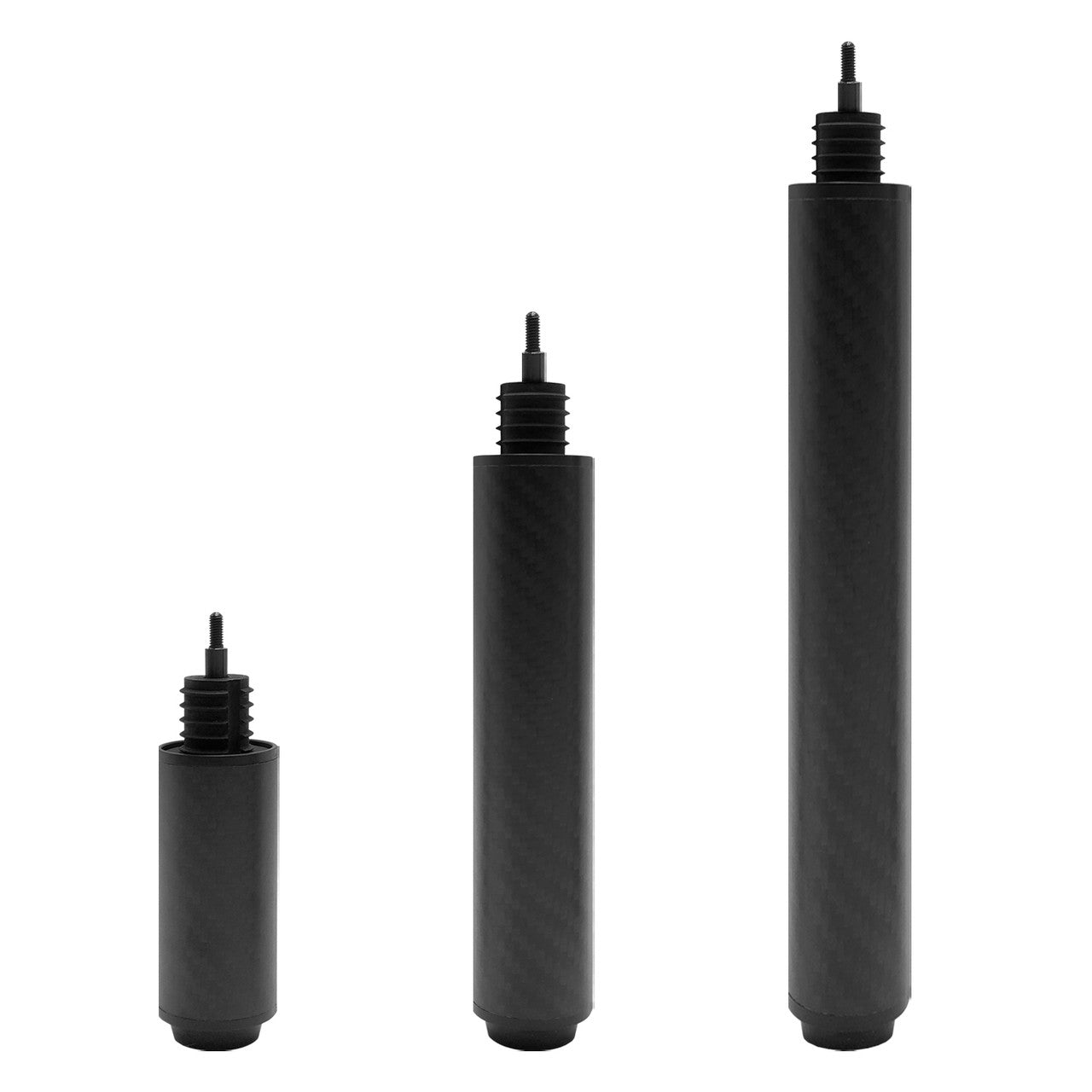 Koda Sports rear carbon fiber butt extension is available in 3", 6" and 10" lengths. The carbon fiber design makes these extensions as cool to look at as they are useful. Fits most of the following cues with a push in bumper and weight bolt installed: