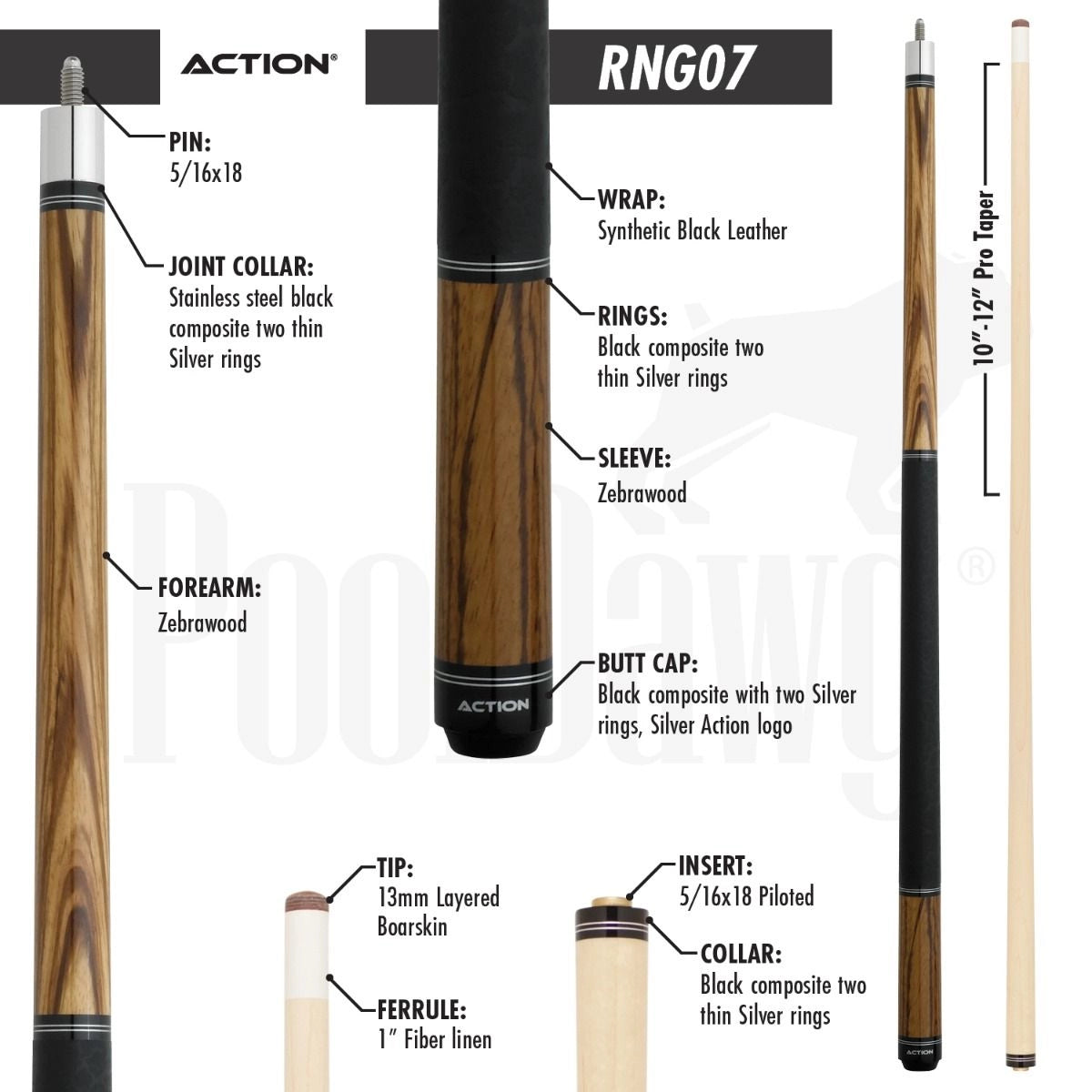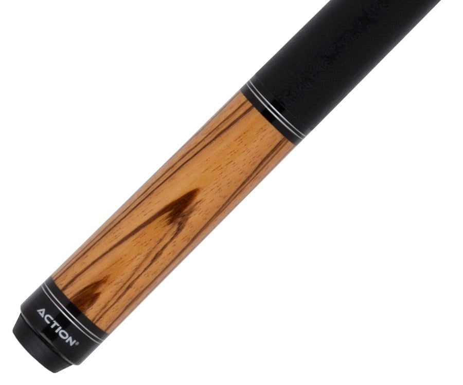 Keep it natural, keep it rustic, keep it real with the Action Rings RNG07 pool cue. Zebrawood on the forearm and sleeve gives this cue an unassuming appearance. Silver rings and a Faux black Leather wrap complete the butt design. Don't be fooled by the rustic design. This cue gives a compact, solid hit from its stainless steel collar and piloted joint. High quality materials, superior craftsmanship and affordable pricing are the characteristics of this cue. Satisfaction is guaranteed with all Action cues.